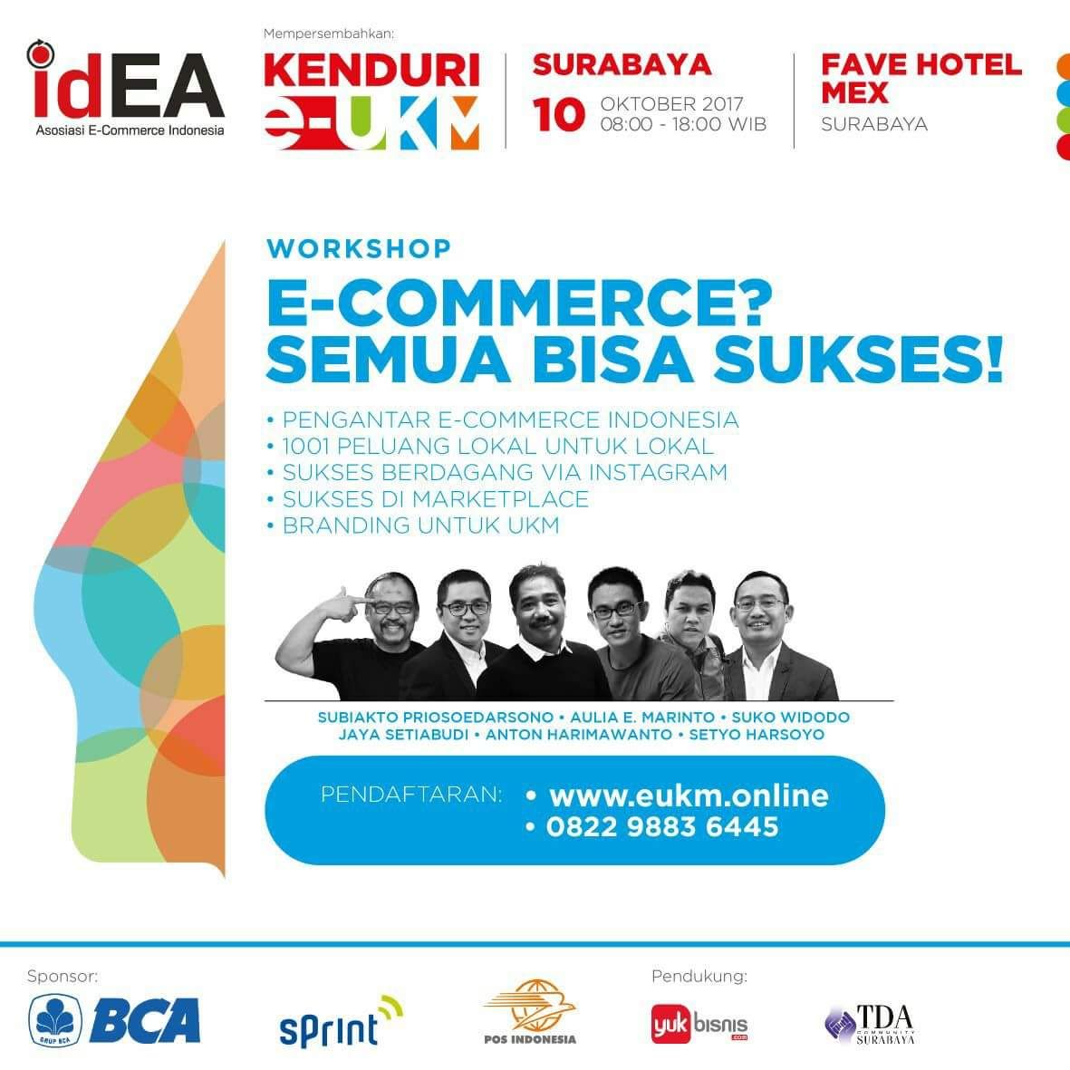 JOSSTODAY.COM – Asosiasi E-commerce Indonesia(idEA) menggelar Kenduri e-UKM di Surabaya, 10 Oktober 2017. Surabaya adalah kota keempat yang menjadi tuan rumah Kenduri e-UKM. Tiga Kota Sebelumnya adalah Yogyakarta, Makassar dan Bandung. Setelah Surabaya, akan ada delapan kota lain yang akan jadi tuan rumah Kenduri e-UKM yaitu Surabaya, Balikpapan, Semarang, Medan, Pontianak, Palembang, Denpasar, dan Solo.